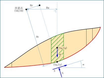 円弧・直線の組み合わせによる任意形状のすべり計算、または範囲を指定した繰り返し円弧すべり計算を2次元のスライス分割法によって計算します。