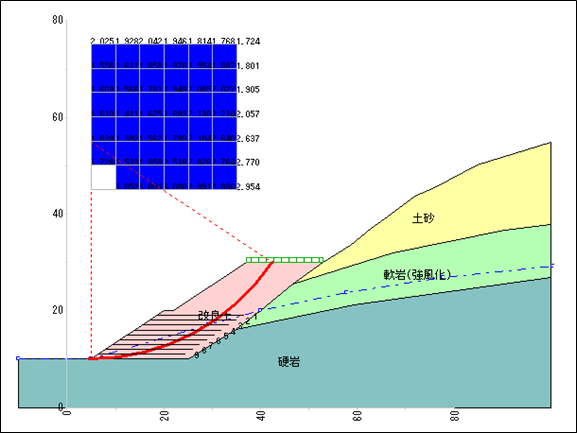 値に応じてすべり面を着色することができ、危険ゾーンを視覚的に把握できます。 |
