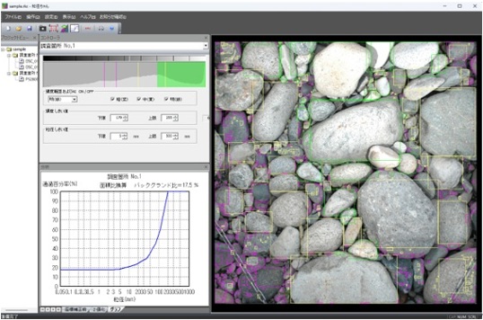 粒度分布値のCSVを生成し、レポート作成を効率化。複数調査位置の合成グラフも作成可能。
